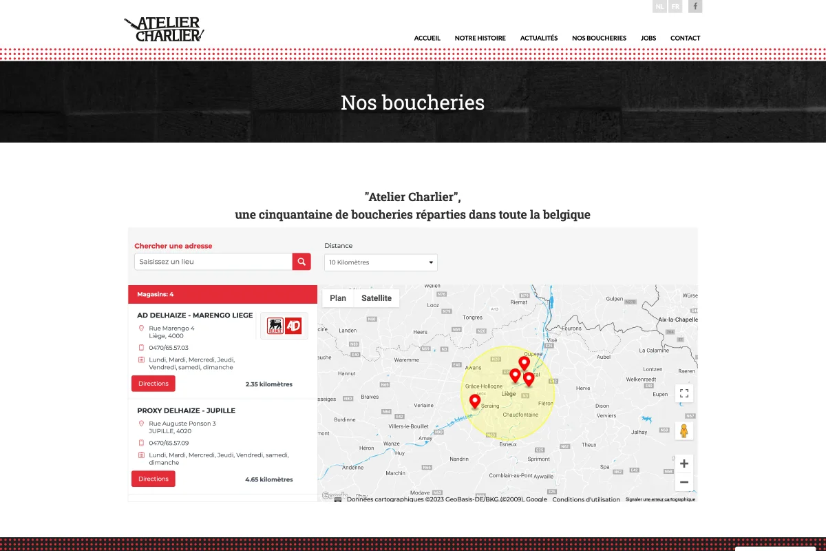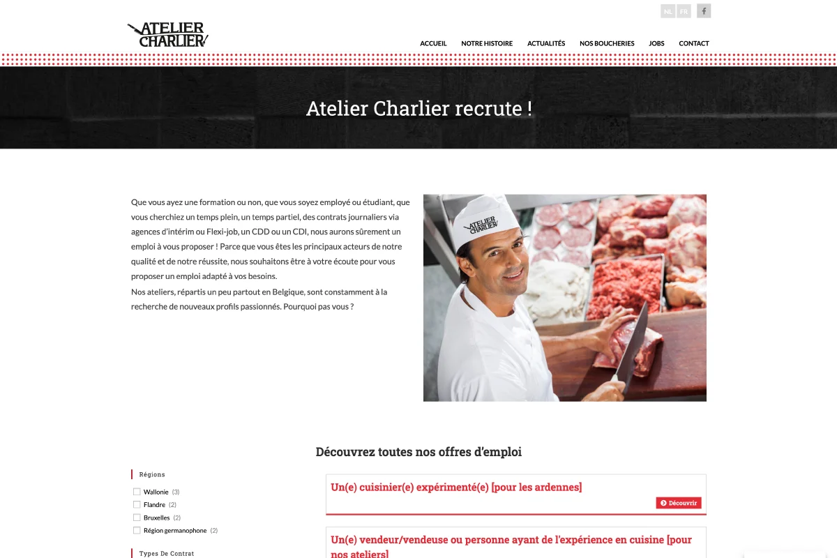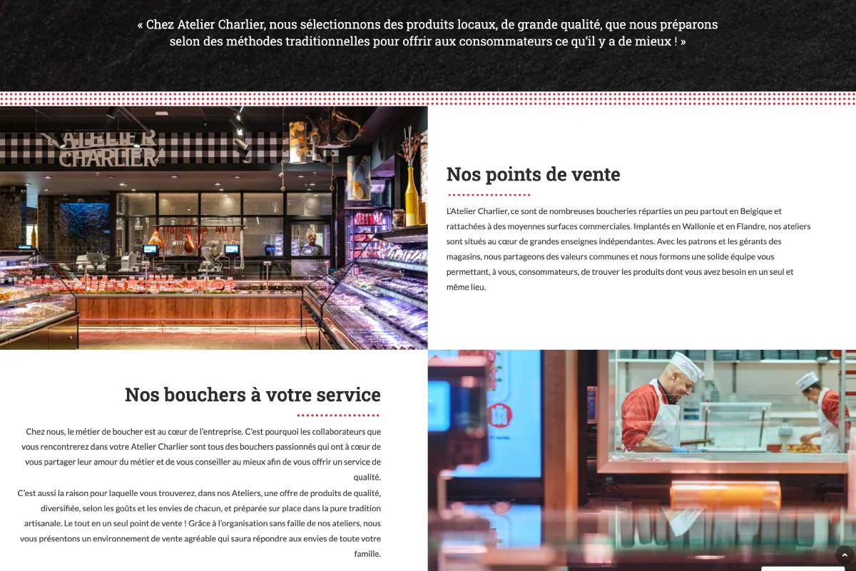 Création d’un site internet permettant de présenter la société “Atelier Charlier”. Ce site devait permettre la localisation des différentes boucheries partout en Belgique, mais également d’attirer de nouveaux employés.